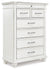 Give your retreat vintage charm with this bedroom set in a beautifully distressed whitewash finish. You'll love the headboard's grand style featuring an inset button-tufted upholstery cushion. Generously scaled moulding, framed drawer fronts, nailhead trim and bun feet enhance the character of this bedroom set—evoking the feel of a quaint cottage escape.