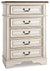 Elevating the art of traditional cottage styling, this bedroom set is your dream retreat realized. A sumptuous beauty, the upholstered bed wows with a distressed chipped white finish for heirloom appeal. Deep tufting on the cushioned upholstered headboard adds such a cozy element sure to put you at ease. Framed drawer fronts, decorative corbels, bail pulls and contrasting wood finished surfaces only add to the charm.